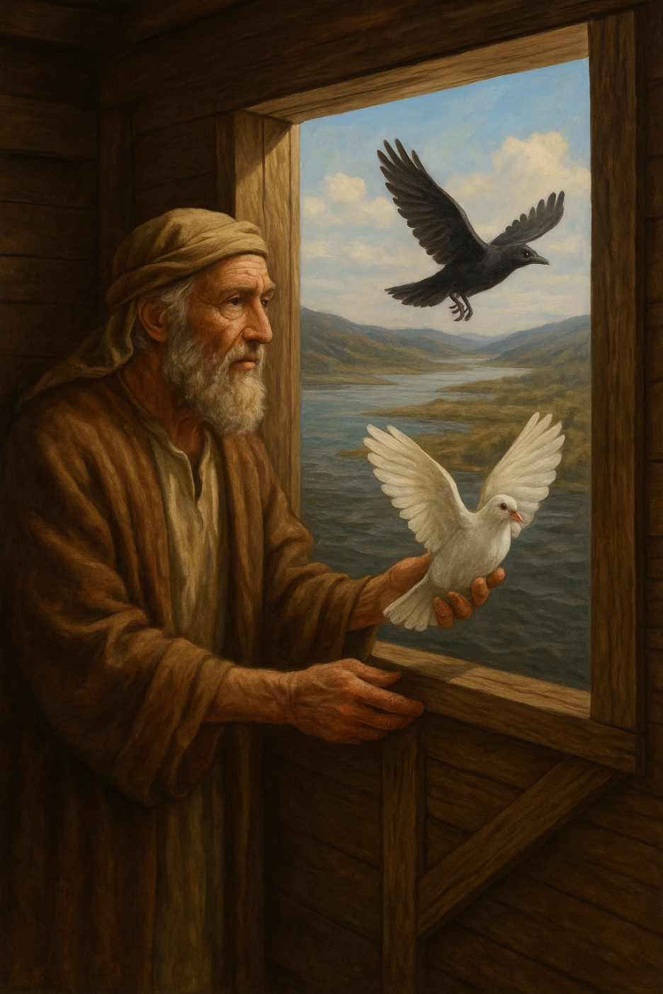 산들의 봉우리가 보인 후에도 40일이 지나서야 노아는 창문을 엽니다.