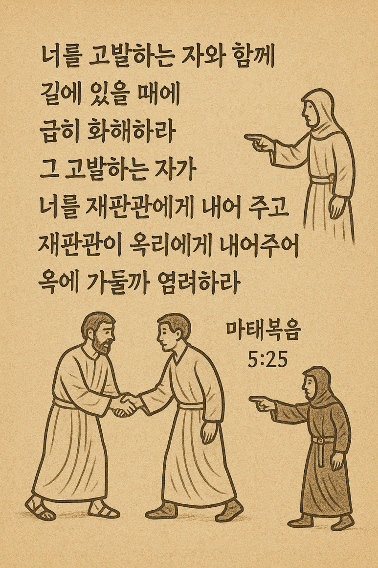 25 너를 고발하는 자와 함께 길에 있을 때에 급히 사화하라 그 고발하는 자가 너를 재판관에게 내어 주고 재판관이 옥리에게 내어 주어 옥에 가둘까 염려하라