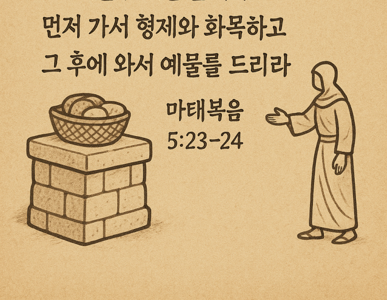 24 예물을 제단 앞에 두고 먼저 가서 형제와 화목하고 그 후에 와서 예물을 드리라