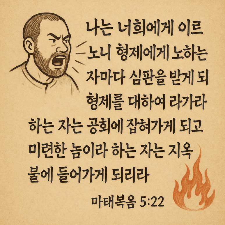 22 나는 너희에게 이르노니 형제에게 노하는 자마다 심판을 받게 되고 형제를 대하여 라가라 하는 자는 공회에 잡혀가게 되고 미련한 놈이라 하는 자는 지옥 불에 들어가게 되리라